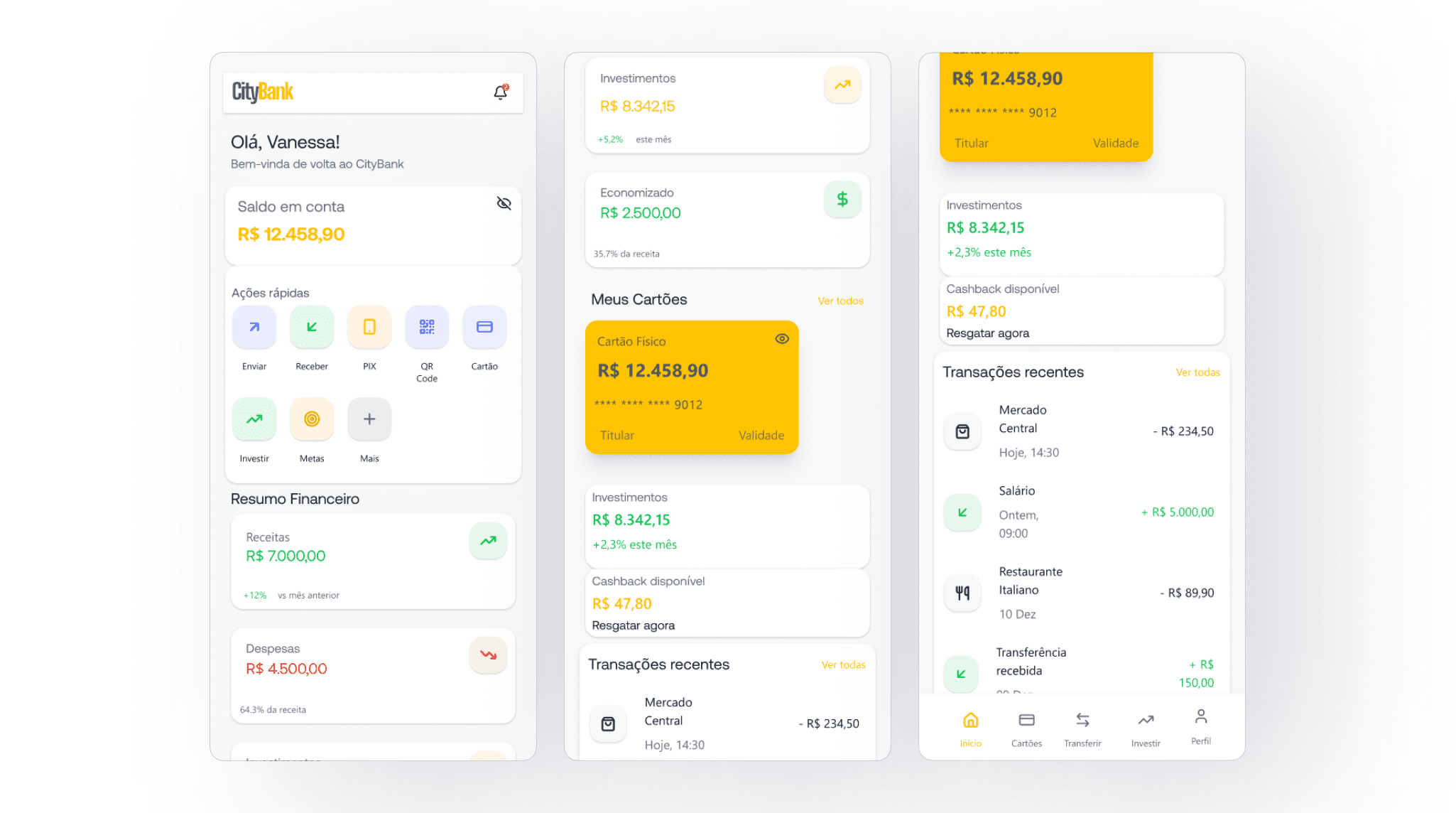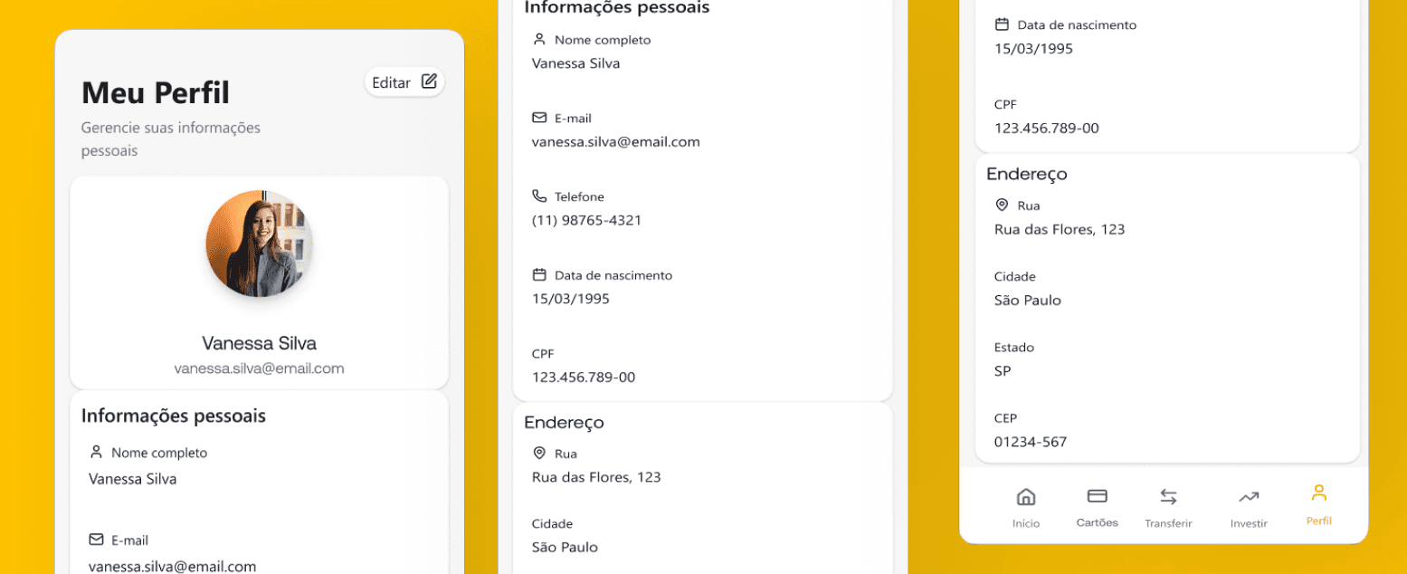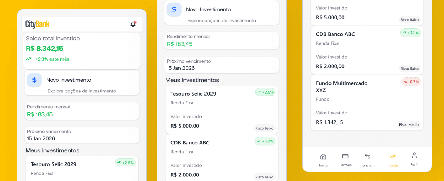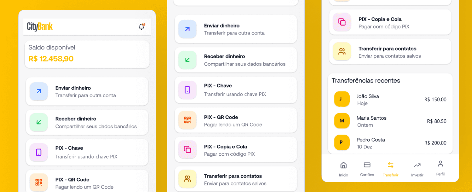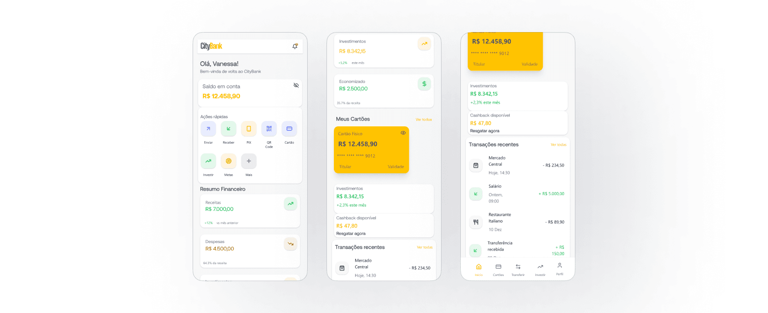 O desafio foi estruturar interfaces que transmitissem segurança, simplicidade e eficiência, características fundamentais para produtos financeiros.