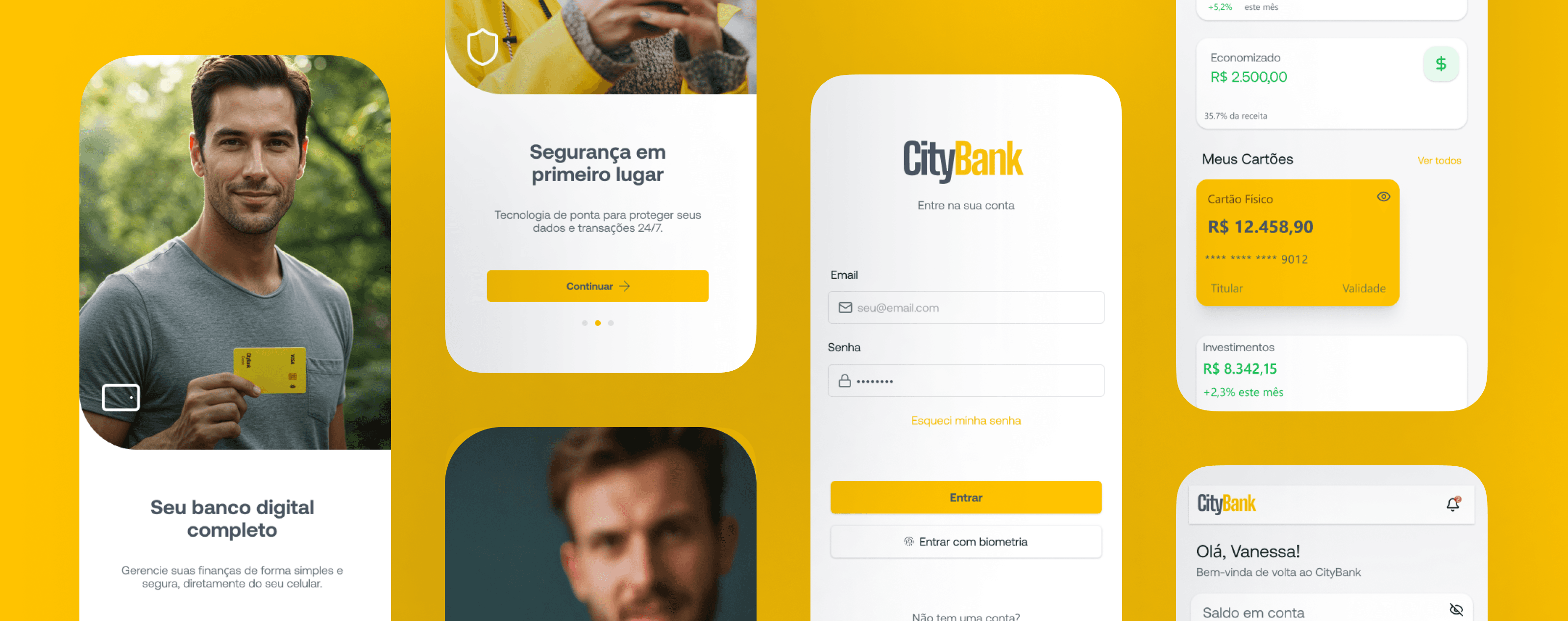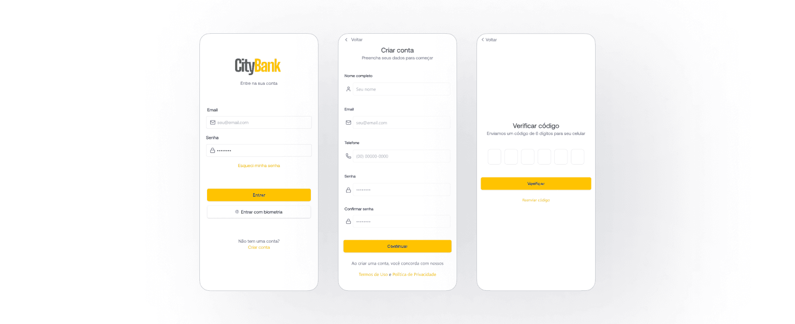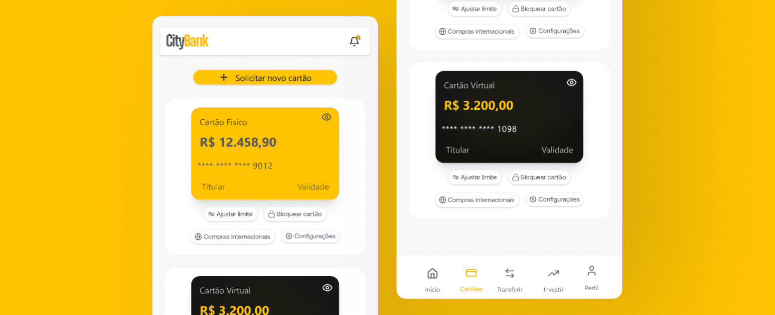 Criar uma experiência visual clara e confiável para um banco digital, cobrindo os principais pontos da jornada do usuário: