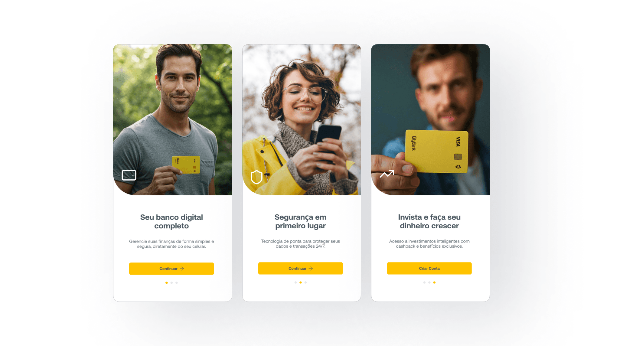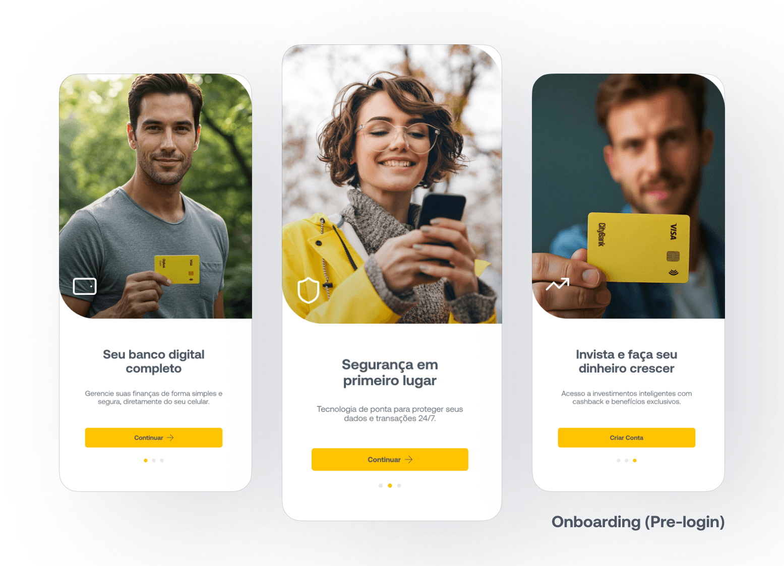 As telas iniciais apresentam o produto, seus benefícios e a proposta do banco digital, preparando o usuário para seguir para o acesso à plataforma.