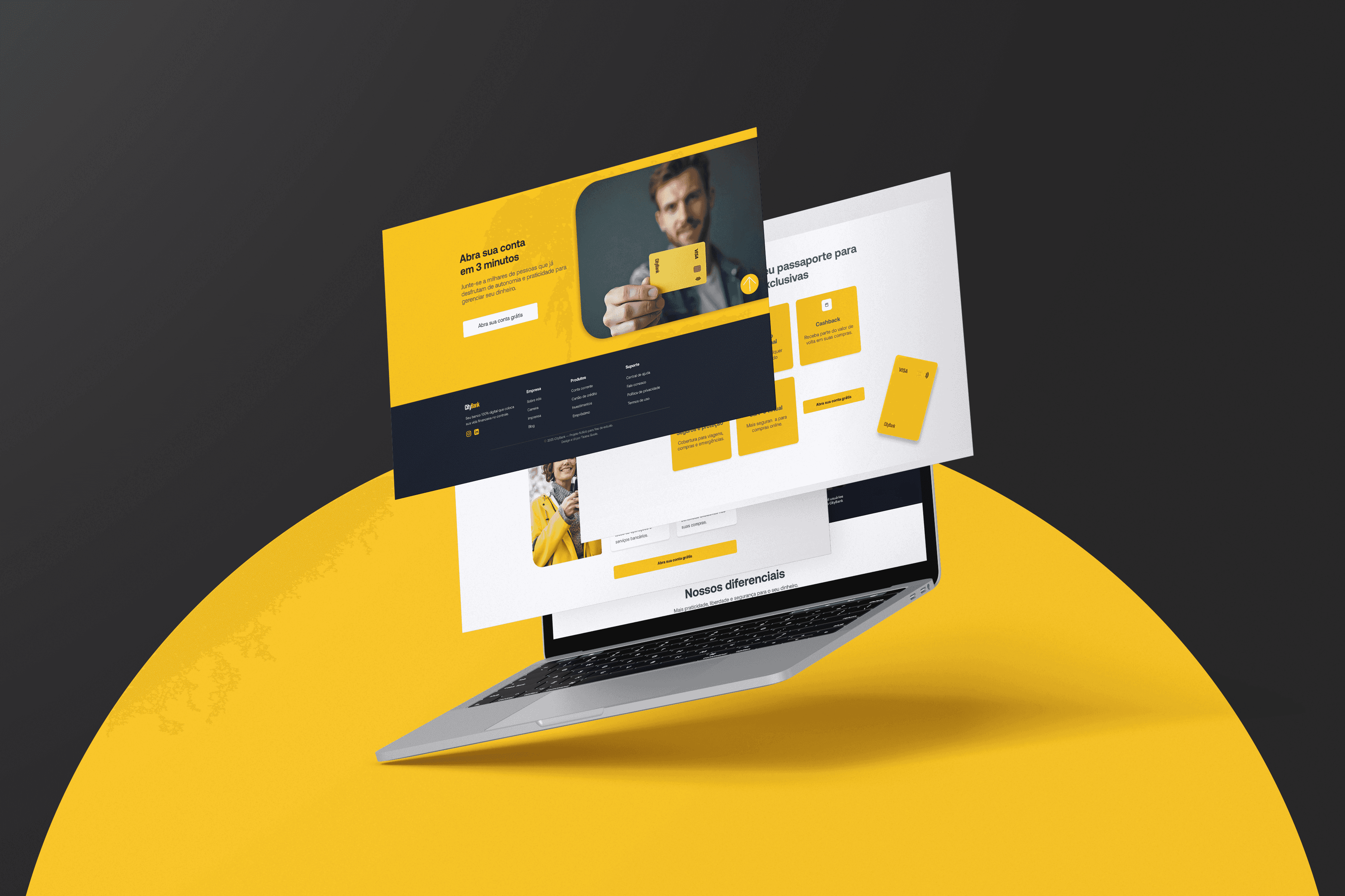 A interface foi construída com uma paleta de cores que transmite confiança e modernidade, combinando azul escuro, branco e detalhes em amarelo para contraste e destaque de CTA.